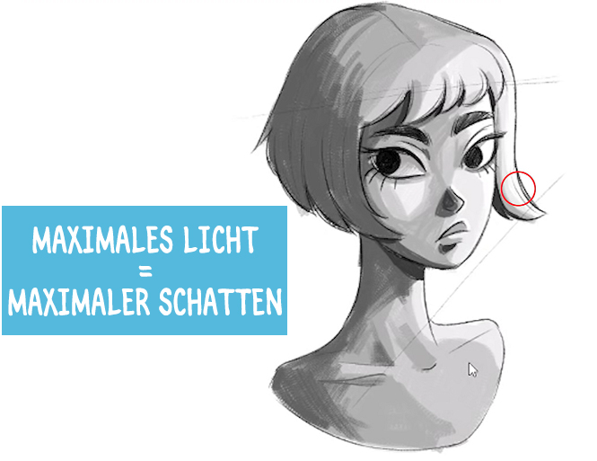 Eine weitere Sache, die du beachten solltest, ist, dass die Highlights, die mit dem hellsten Weißton dargestellt werden, immer in den Bereichen liegen sollten, die der Lichtquelle am nächsten sind. Zum Beispiel kann in unserer Zeichnung das Licht auf der Schulter nicht so hell sein wie das Licht auf dem Gesicht oder den Haarsträhnen, die der Lichtquelle am nächsten sind.