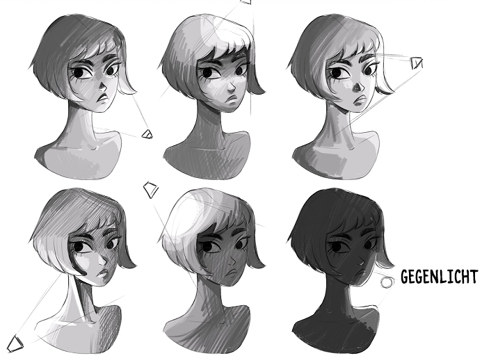 Versuche nach Möglichkeit, mit Aktivitäten zu üben, die dich motivieren. Ich verliere schnell die Motivation, wenn ich Posen oder Fotos reproduziere, aber ich liebe es, mit einfachen Charakterentwürfen, wie denen im Bild unten, zu arbeiten, um meine Beleuchtungstechniken zu üben. Du kannst online nach Posen deiner Lieblingsfiguren suchen und probieren, verschiedene Arten von Beleuchtung auf sie anzuwenden, wobei sich die Lichtquellen in verschiedenen Positionen befinden und nur mit einem Bleistift schattiert werden sollte. Kurz gesagt, bei Umgebungslicht, bei dem die Beleuchtung allgemeiner gehalten ist, sind Licht und Schatten weicher, während bei direktem Lichteinfall der Übergang zwischen Licht und Schatten stark definiert ist.
