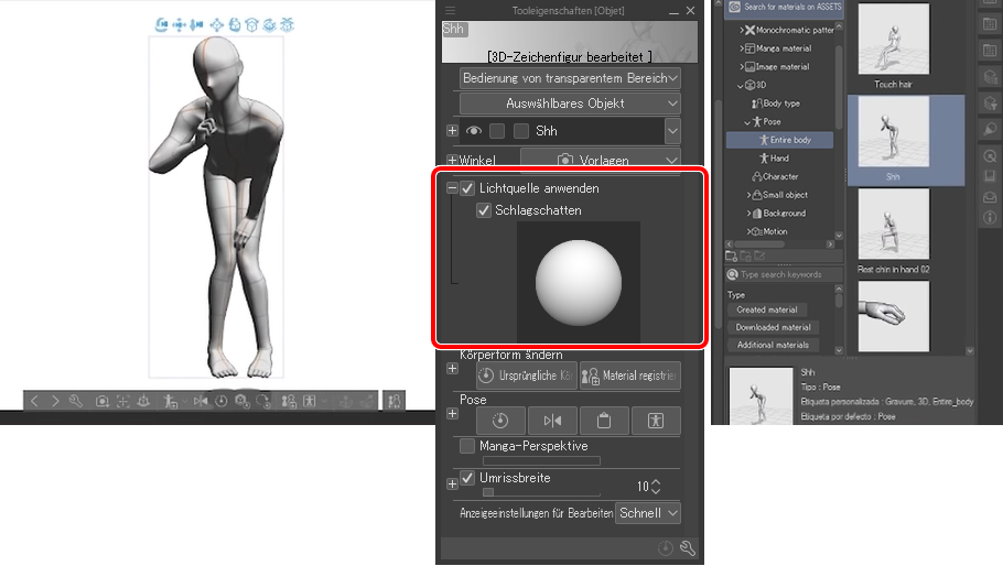 CLIP STUDIO PAINT-Nutzer haben auch Tools, die die Aufgabe erheblich erleichtern, wie die 3D-Zeichnungsfigur, die automatisch Schatten wirft. Du kannst die Position der Lichtquelle, die Körperform und die Pose entsprechend ändern. Sobald du die 3D-Figur auf der Leinwand hast, ändere die Beleuchtungsfunktion in „Tooleigenschaften“-Palette > Lichtquelle anwenden. Um die Position der Lichtquelle zu bearbeiten, ziehe die im Bild unten rot eingekreiste Kugel in die entsprechende Richtung. Das Einrichten der Beleuchtung für diese Figuren kann ein guter Ausgangspunkt für Einsteiger sein, oder auch wenn du mit einer besonders komplexen Pose arbeitest.