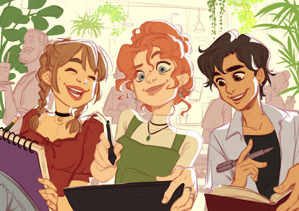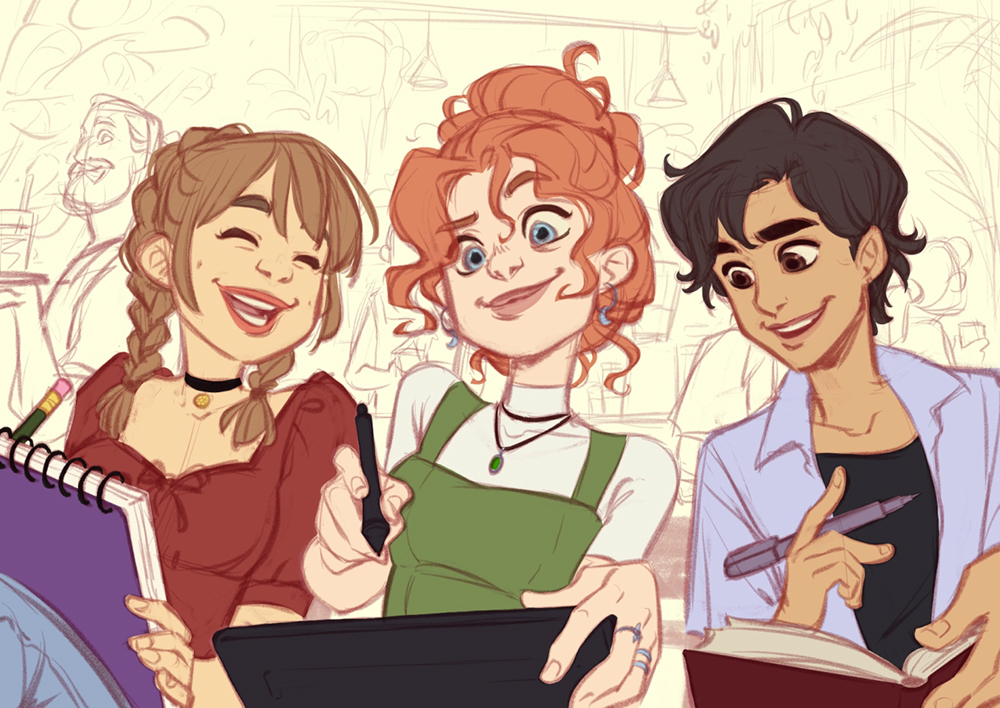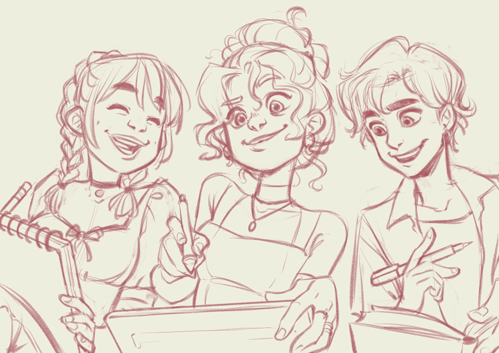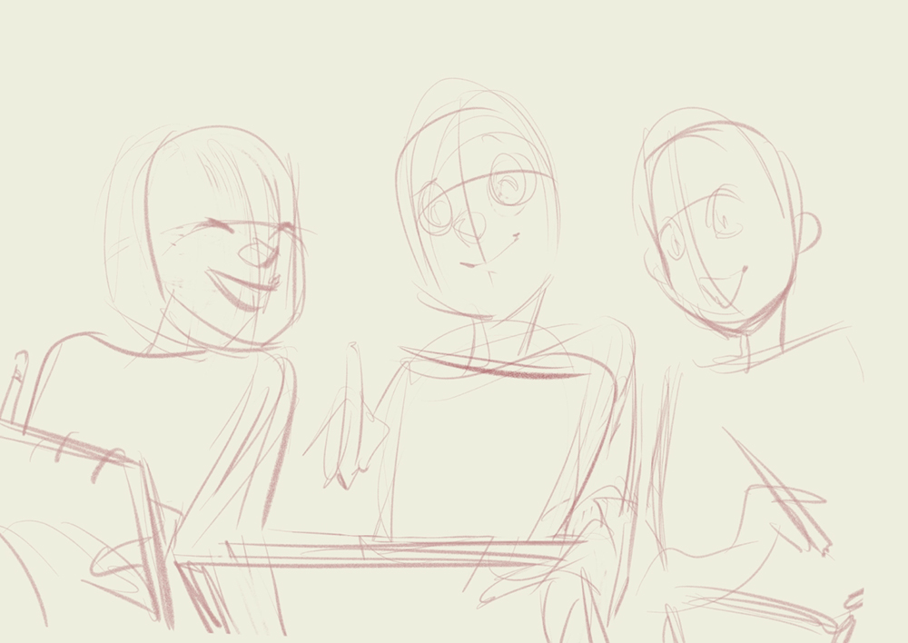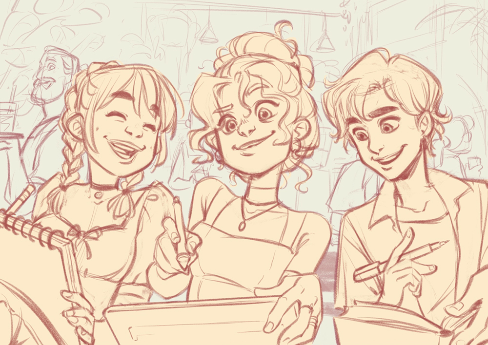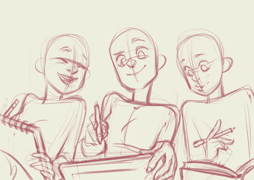 Nun verringere ich die Deckkraft meiner Skizzenebene und lege eine neue darüber an. Darauf zeichne ich meine Charaktere detaillierter. Ich gebe ihnen sympathische Gesichter und mache mir auch Gedanken zu ihren Frisuren und Outfits. Und natürlich ist es für diese Szene wichtig, dass sie alle zeichnen. Ich gebe allen unterschiedliche Zeichenwerkzeuge für mehr Vielfalt, schließlich hat jeder Künstler verschiedene Vorlieben in Bezug auf Skizzenbücher und Zeichengeräte.