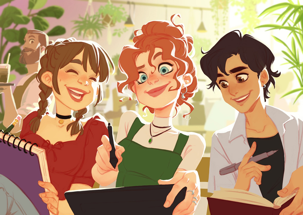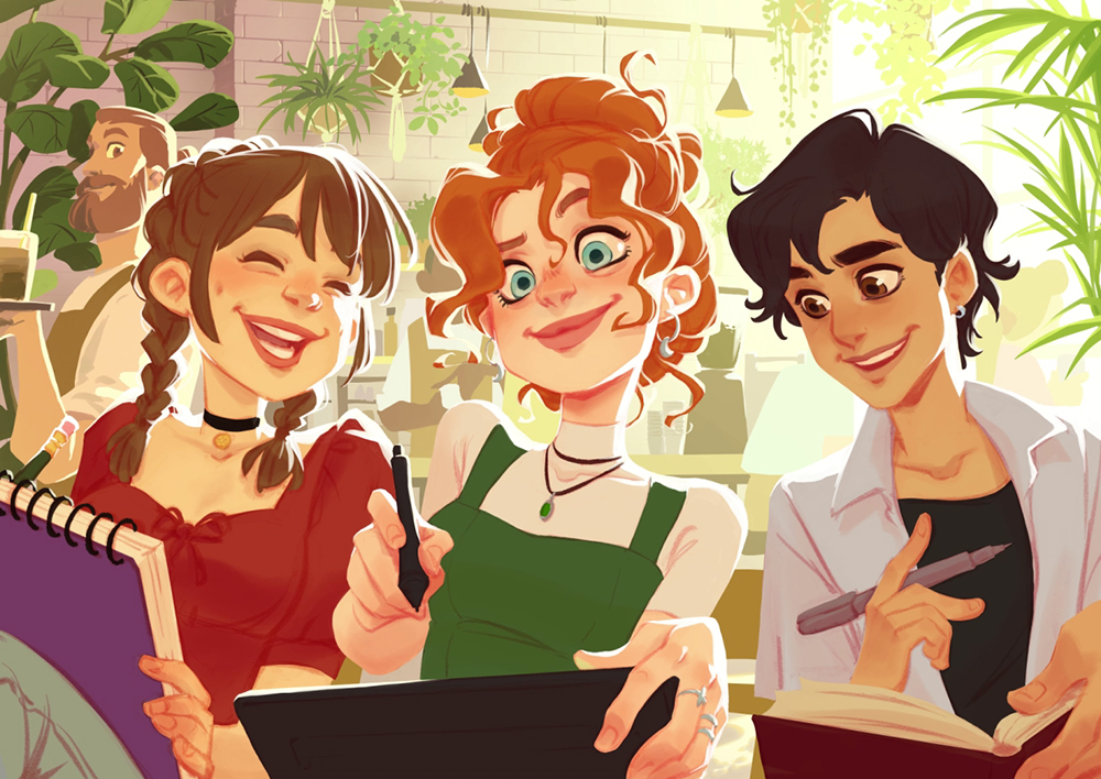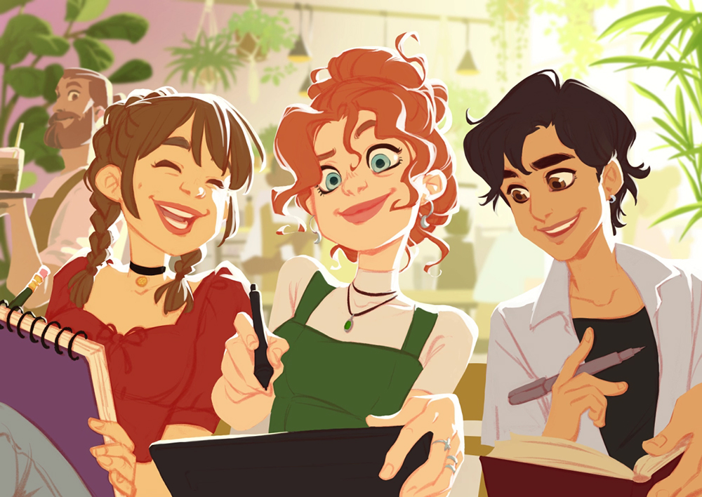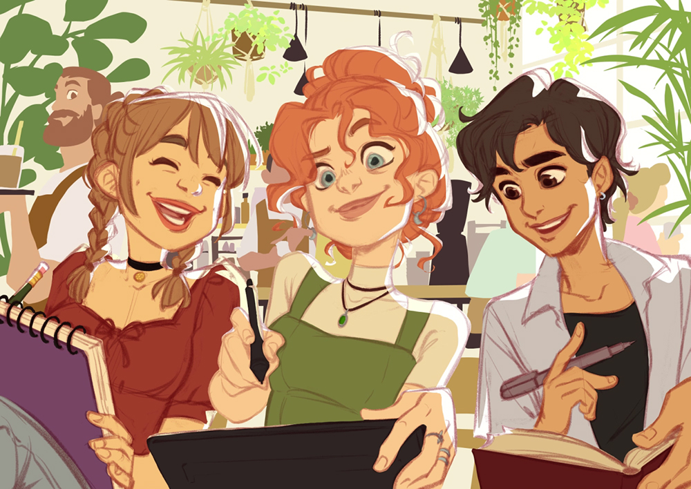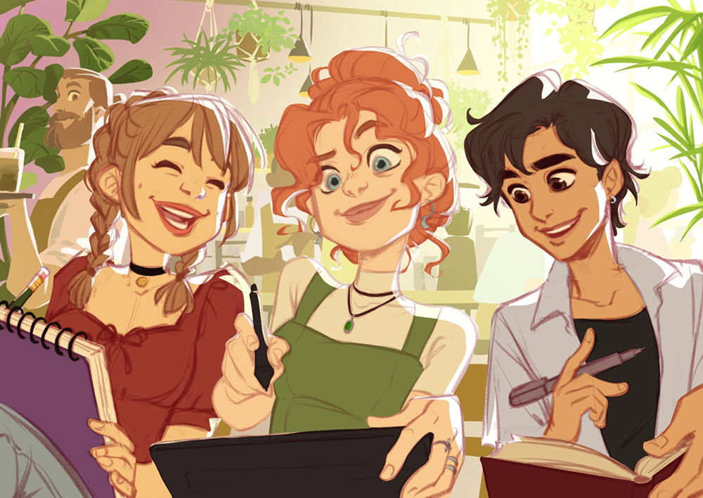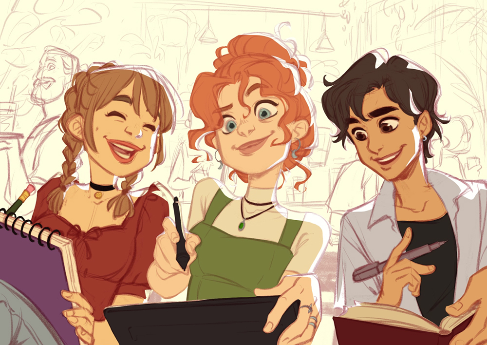 Nun verringere ich die Deckkraft meiner Skizzenebene und lege eine neue darüber an. Darauf zeichne ich meine Charaktere detaillierter. Ich gebe ihnen sympathische Gesichter und mache mir auch Gedanken zu ihren Frisuren und Outfits. Und natürlich ist es für diese Szene wichtig, dass sie alle zeichnen. Ich gebe allen unterschiedliche Zeichenwerkzeuge für mehr Vielfalt, schließlich hat jeder Künstler verschiedene Vorlieben in Bezug auf Skizzenbücher und Zeichengeräte.