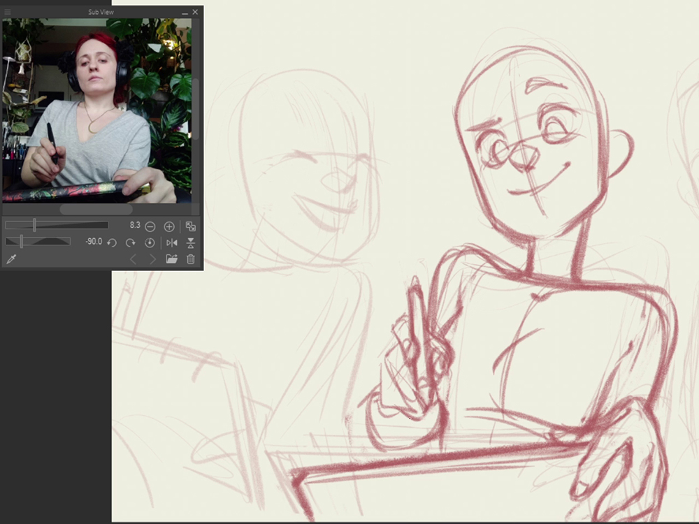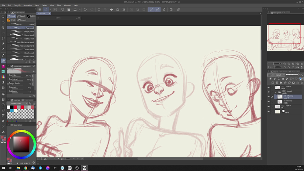 Wenn ich mit der groben Planung zufrieden bin, fange ich damit an, meine Charaktere auszuarbeiten. Manchmal kriegt man eine Pose oder Handhaltung nicht auf Anhieb hin. Da hilft es, sich an Vorlagen zu orientieren. Am einfachsten finde ich es, einfach schnell ein Handyfoto von mir selbst zu machen und es neben mein Bild zu legen. Dafür benutze ich das Werkzeug unter Fenster > Unteransicht.