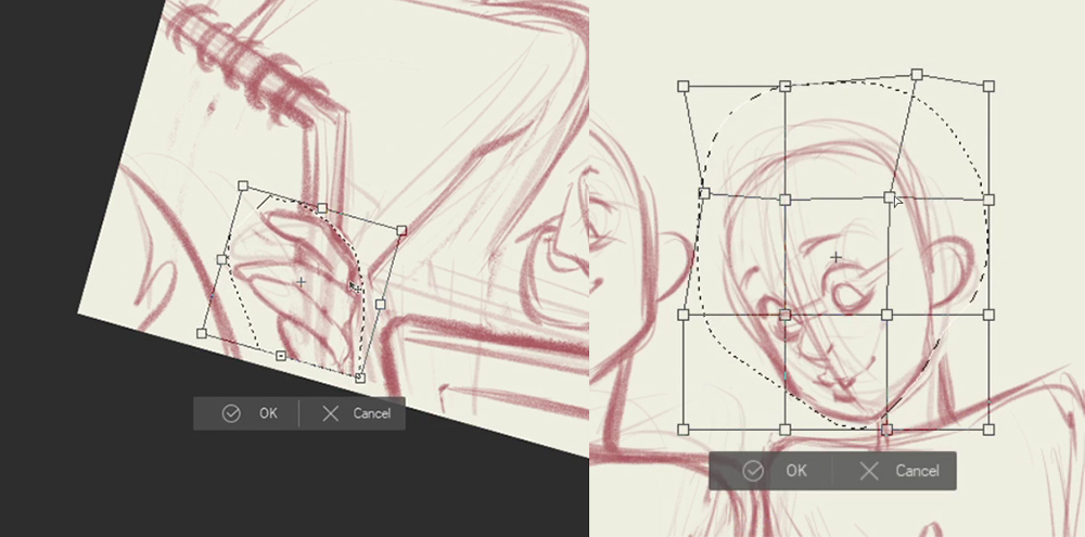 Langsam nehmen die Figuren Gestalt an. Während diesem Prozess verwende ich oft nützliche Verformungs-Tools, wenn z.B. eine Hand zu groß geraten ist, oder ich die Kopfform von einem Charakter leicht ändern will, ohne alles neu zeichnen zu müssen. Dafür wähle ich den Teil, den ich anpassen möchte, mit dem Lasso-Werkzeug aus und benutze dann Transformieren > Skalieren/Drehen für simplere Verformungen, oder Transformieren > Formgitter Transformation für aufwändigere Änderungen.