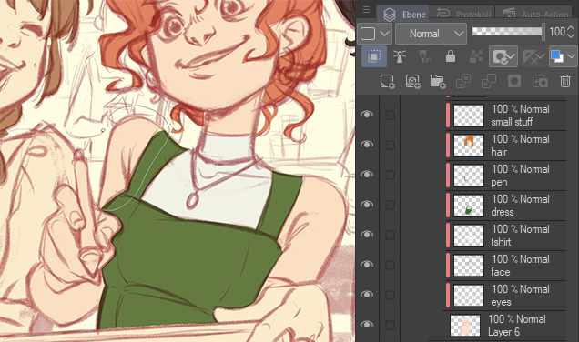 Alle Ebenen, die zu einem Charakter gehören, lege ich zusammen in einer Gruppe ab. Es werden am ende ganz schön viele Ebenen sein und die einzelnen Gruppen kann man praktischerweise zuklappen, wenn man sie gerade nicht braucht.