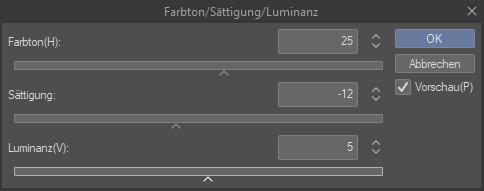 Wenn ich mit einem Farbton nicht auf Anhieb zufrieden bin, nutze ich gerne das Werkzeug Bearbeiten > Farbkorrektur > Farbton/Sättigung/Luminanz um schnell verschiedene Töne durchzuprobieren. Wichtig ist, dass das Häkchen bei Vorschau an ist, denn sieht man seine Änderungen gleich auf dem Bild.