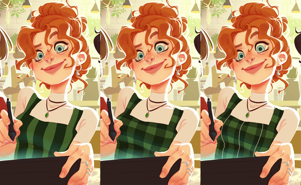 Für mehr Detailreichtum gebe ich einigen Kleidungsstücken meiner Figuren Muster. Diese kann man z.B. per Hand einzeichnen, wie das Karo-Muster vom grünen Kleid.