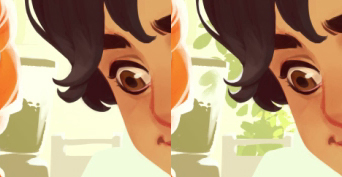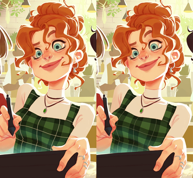 Zunächst passe ich die Farbe von meiner Skizzenebene an, damit sie leichter und wärmer wirkt. Ich gehe nochmal über die Farbflächen der Charaktere mit Farbton/Sättigung/Luminanz um sie nach Bedarf knalliger zu machen. Dabei achte ich darauf, dass sie sich gut vom Hintergrund abheben. Und dann beginne ich auf einer neuen Ebene Details auszuarbeiten, dabei beginne ich meistens bei den Augen und dem Gesicht meiner Charaktere, da wir diese immer als erstes wahrnehmen und sie vermutlich den wichtigsten Teil einer Charakter-Illustration darstellen.