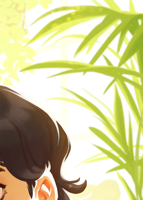 Während der Ausarbeitung meiner Charaktere merke ich an manchen Stellen, dass sich der Hintergrund nicht gut vom Charakter trennen lässt. Hier zum Beispiel hat es mir nicht gefallen, dass man die helle Lichtkante auf dem Haar nicht sehen konnte, weil der Hintergrund auch sehr hell war. Zum glück kann man das schnell ändern mit Hilfe von einer neuen Zimmerpflanze.