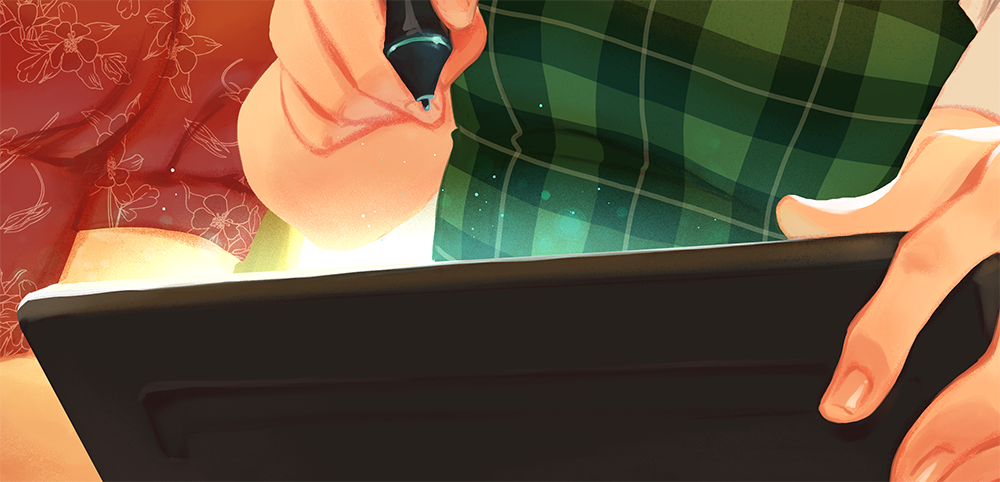 Auf neuen Ebenen zeichne ich ein paar Lichteffekte und feine Staubkörner, die von der Sonne oder dem Tablet-Bildschirm beleuchtet werden. Bei solchen Effekten muss man aufpassen, dass man nicht zuviel davon macht, aber in kleinen Mengen geben sie Illustrationen einen Hauch Magie.