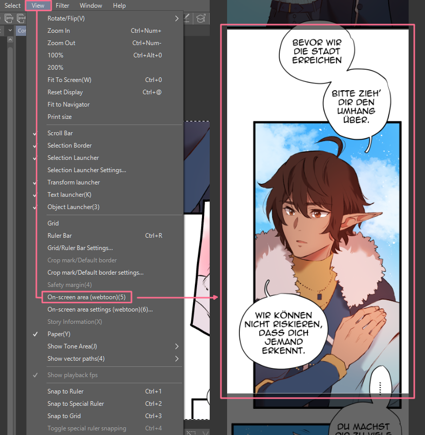 Tipp: in Clip Studio Paint unter „View -> On-screen area (Webtoon)“ aktivieren, um eine Vorschau zu erhalten, wie die Panels auf einem Smartphone aussehen würden.