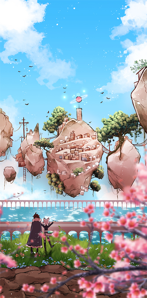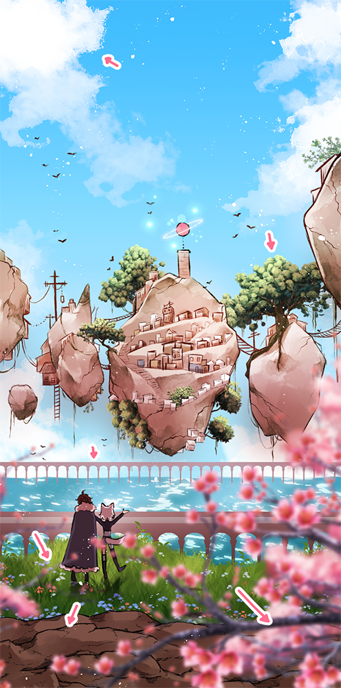 Brücken, Bäume, Wiese und Blumen, der Boden und die Kirschblüten im Vordergrund, sowie die Wolken und das Wasser sind alles Brushes. Die schwebenden Felsen sind jedoch Freihand gezeichnet, damit mein Grundstil in diesem Panel, trotz der verschiedenen Hilfsmittel, erhalten bleibt.