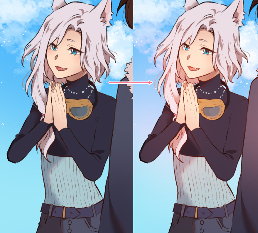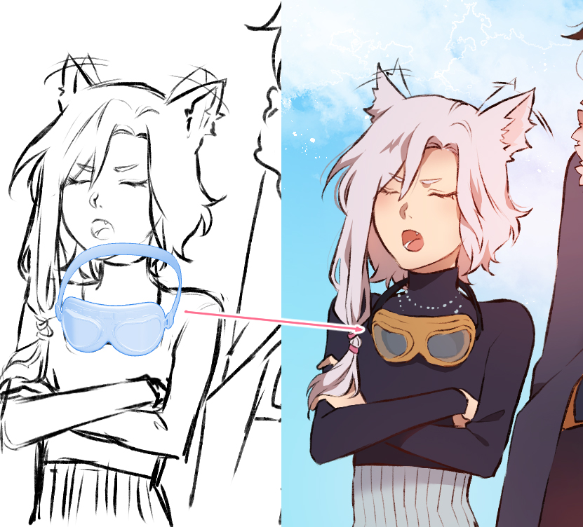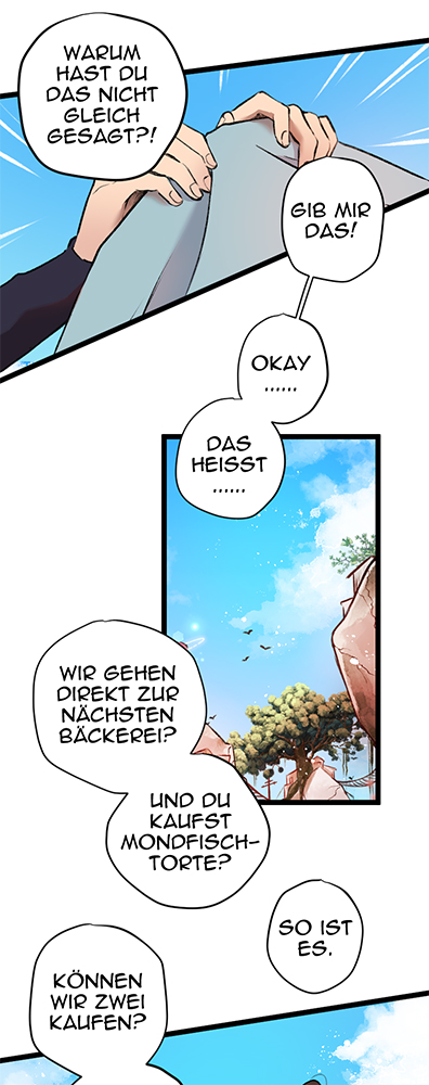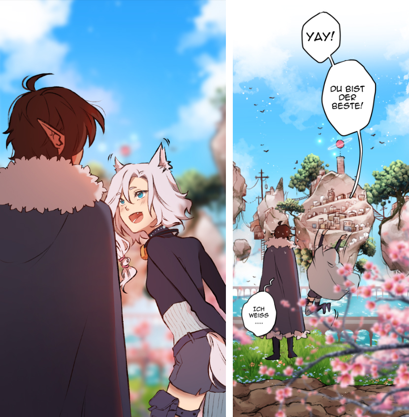In diesem Comic habe ich den Hintergrund beispielsweise noch einmal verschwommen eingefügt, um die Leser daran zu erinnern, wo wir uns befinden, und am Ende um zu zeigen, dass die Charaktere sich noch immer auf dem Weg zur schwebenden Stadt zu finden.