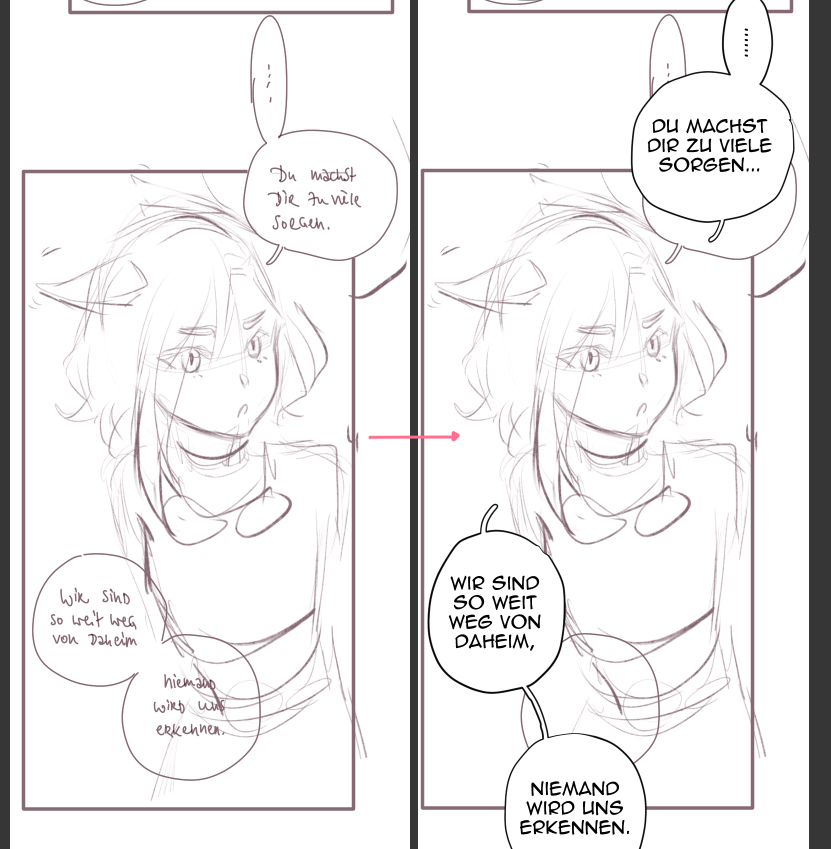 Text und Sprechblasen, sowie deren Positionen lege ich immer bereits beim Skizzieren fest.