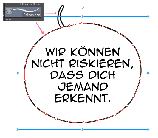 Ich würde nicht empfehlen, diesen Schritt auf einen späteren Zeitpunkt zu verschieben, denn es besteht die Gefahr am Ende zu merken, dass wichtiger Text wichtige Panels verdecken könnte. Es ist wesentlich einfacher und schneller, beim Skizzieren Anpassungen an Text und Bild vorzunehmen, als am Ende, wenn Änderungen mit mehr Aufwand verbunden sind. Meiner Meinung nach sollten Text und Sprechblasen optisch zum Rest des Comics passen, daher zeichne ich jede Sprechblase und Sprechblasenfahne Freihand mit dem „Balloon-Pen“.