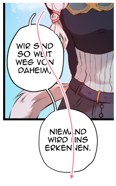 Es lohnt sich, vor Beginn des Comics ein paar verschiedene Methoden und Looks zu testen, um etwas zu finden, das einem persönlich gefällt und man für das komplette Comic anwenden kann. Des Weiteren halte ich es für wichtig, nicht zu viel Text in eine Sprechblase zu setzen, das kann die Leser schnell überfordern und verhindern, dass sie weiterlesen. Ich empfehle, größere Textmengen in mehrere Sprechblasen aufzuteilen und diese miteinander zu verbinden. Das lockert nicht nur die Menge des Textes optisch auf, sondern kann auch dabei helfen, den Blick der Leser gezielt durch die Panels zu leiten.