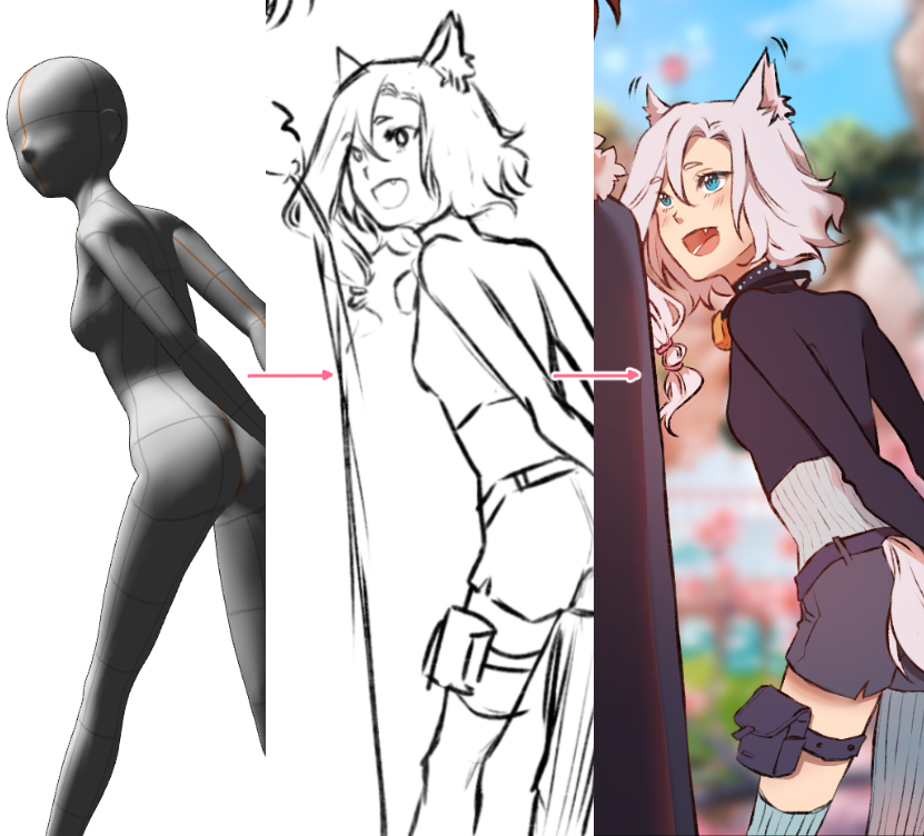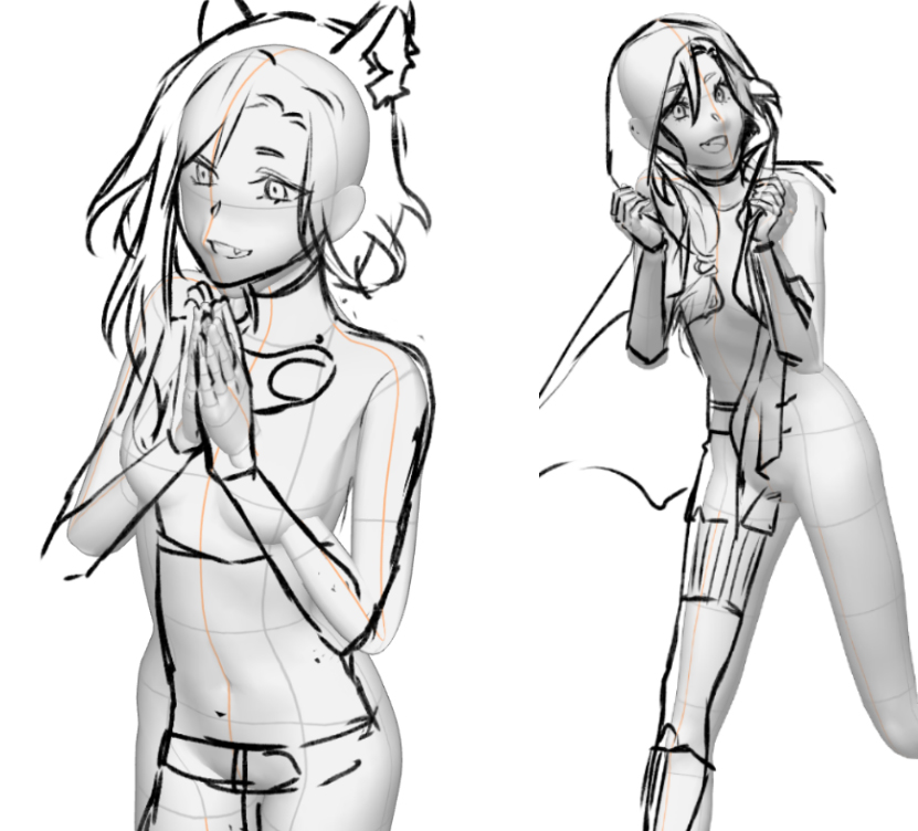 Ich würde nicht empfehlen, 3D-Figuren 1:1 abzupausen, die Posen wirken oft leblos und steif, und passen in vielen Fällen nicht zum eigenen Stil des Zeichners. Ich betrachte sie lieber als Referenz, nach der ich mich grob richte, aber auch frei genug fühle, um von ihr abzuweichen, wenn ich die Notwendigkeit sehe.