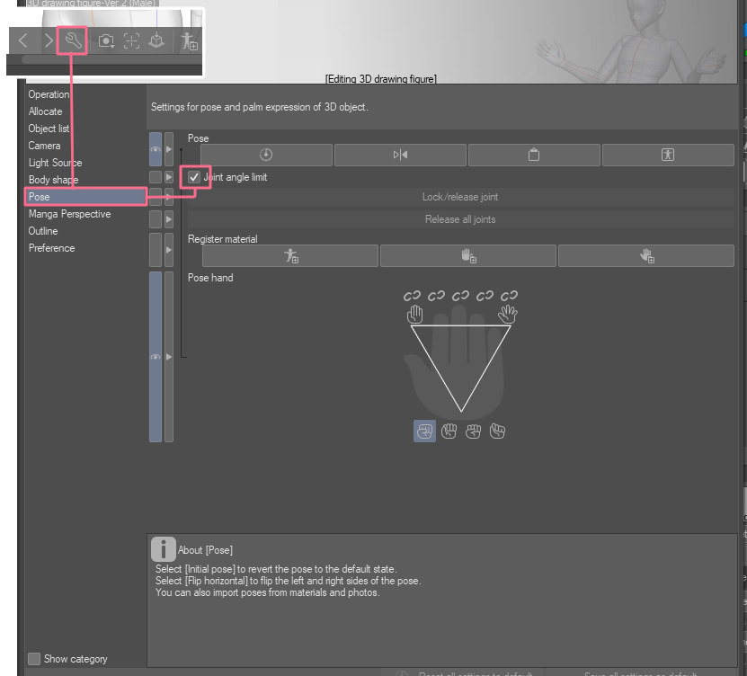 Tipp: 3D-Figur mit dem „Operation-Tool“ auswählen, unter der Figur auf das Werkzeug-Tool klicken, im Tab „Pose“ den Haken bei „joint angle limit“ entfernen, für mehr Freiraum beim Posieren.