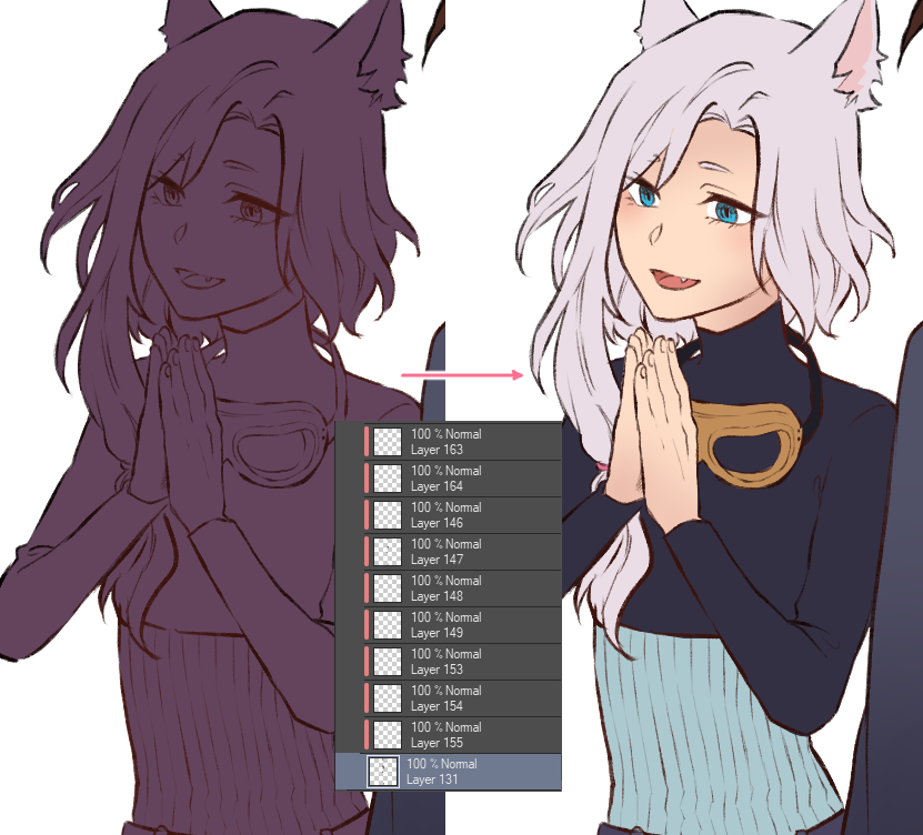 Mein Kolo-Prozess beginnt damit, pro Seite jeweils eine Ebene für jeden Charakter anzulegen, die ich mithilfe eines Lasso-Fill-Tools mit einer Farbe fülle. Je nach Lineart-Qualität kann es sein, dass noch nachbearbeitet werden muss.