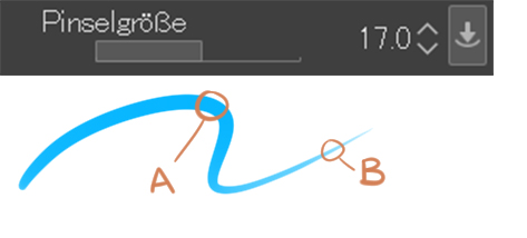 – Pinselgröße: Die Breite der Linie variiert je nach Pinselgröße und dem Druck, den wir mit dem Stylus auf unser Grafiktablett ausüben. (A) Maximale Größe, (B) Breite bei minimalem Druck.