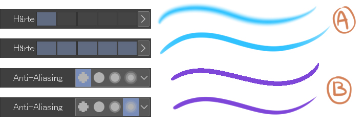 – Härte / Anti-Aliasing Hiermit wird der Rand einer Linie weicher dargestellt. Schau, wie sich dies in den beiden Fällen auf die Linie auswirkt: (A) Härte / (B) Anti-Aliasing.