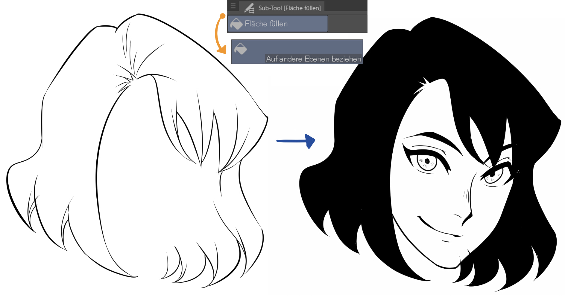 Ich benutze den gleichen Trick mit dem Farbeimer wie zuvor. Achte hier darauf, dass du auf einer anderen Ebene arbeitest! Beim Ausblenden der Ebene für das Gesicht siehst du, dass die Haarlinien nicht geschlossen sind, so dass das „Fläche füllen“-Tool die gesamte Leinwand ausfüllen würde. Um dies zu vermeiden, klicke auf die Option „Auf andere Ebenen beziehen“. Dadurch beachtet die Software andere sichtbare Ebenen.