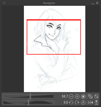 – Navigator Fenster: Wenn ich zeichne, zeichne ich unzählige Male dieselbe Linie, zoome hinein und drehe die Leinwand, um bequemer zu zeichnen. Bei Linien, die viel Platz beanspruchen, zoome ich heraus. Bei entsprechend kurzen Linien oder Linien, die mehr Details und Präzision erfordern, zoome ich so weit wie möglich ein. Natürlich drehe ich dabei die Leinwand, um meinen Bewegungswinkel meines Handgelenks zu unterstützen. So erzeuge ich die natürlichsten Linien, die ich zeichnen kann.
