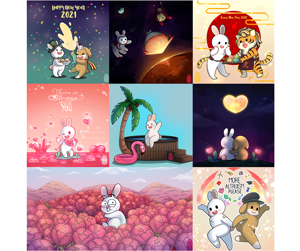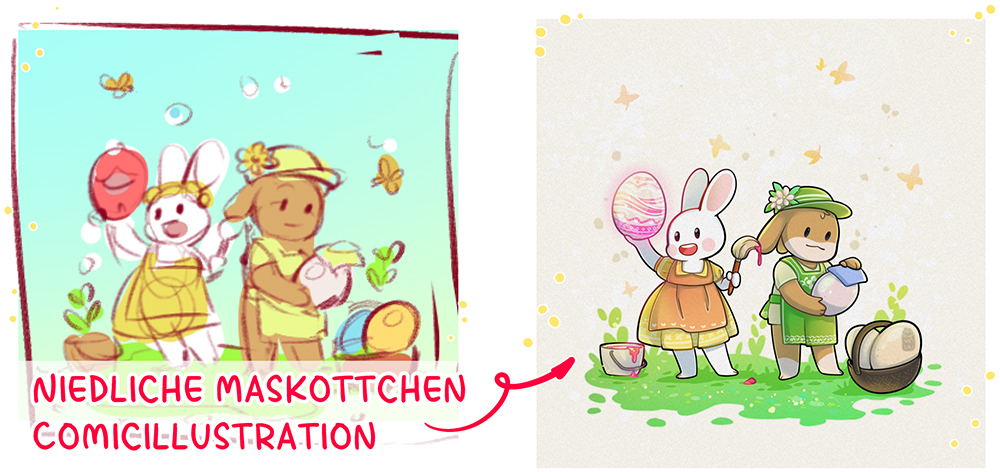 Bevor es mit den Skizzen losgeht, habe ich ein paar Referenzen meiner Tinybuns zusammengesucht, um nicht zu sehr vom Stil abzuweichen. Tinybuns nutze ich sehr gerne um saisonale Motivkarten und Geburtstagskarten zu kreieren und für eine Osterillustration bieten sich die zwei sehr gut an.