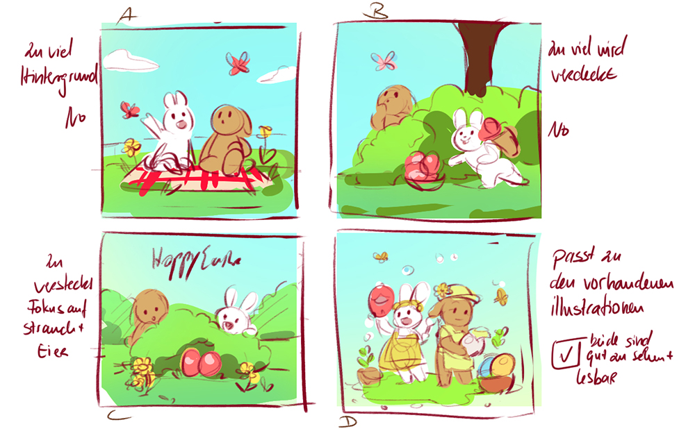 Der Vorteil beim Arbeiten in einem sehr kleinen Format ist, dass zu wenig Platz für Details vorhanden ist und man sich so viel mehr auf die Gesamtkomposition konzentrieren kann. Für eine bessere Einschätzung werden die Skizzen in passende, frühlingshafte Farben eingefärbt, um die Farbstimmung zu testen.