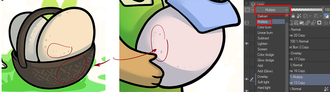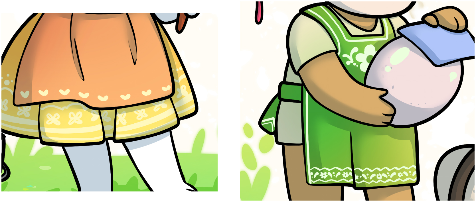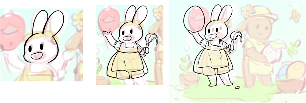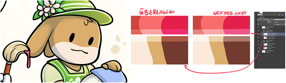 Als Schattenfarbe nutze ich meist einen Ton zwischen einem warmen Rot bis hin zu einem kalten Lila-Ton – also eine Farbe, die der Farbkomposition zuträglich ist. Für die Schatten der Tinybuns habe ich einen Farbton gewählt, der den Wiedererkennungswert der Hasen garantieren soll. Es ist ein sehr helles Blaugrau.