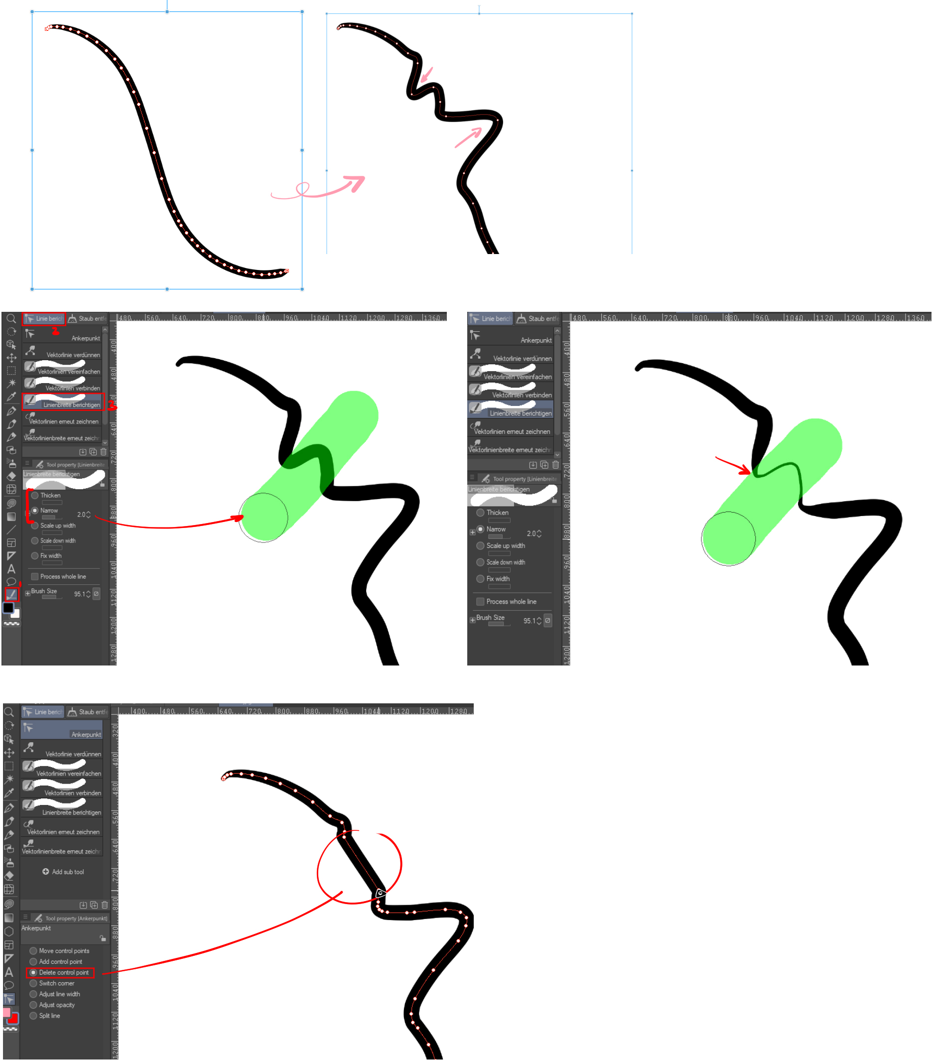 Wenn man jetzt in CLIP STUDIO PAINT die gezeichnete Linie mit SHIFT + Linksklick anklickt erscheint eine schmalere Linie mit kleinen Punkten. Diese Punkte können einzeln gelöscht, verschoben oder vermehrt werden. So in etwa schaut es auch in Vektorprogrammen aus. Mit dieser App kann man sie nur wesentlich flüssiger zeichnen, wie man hier gerade sieht, und das Erstellen der Lineart ist super einfach.