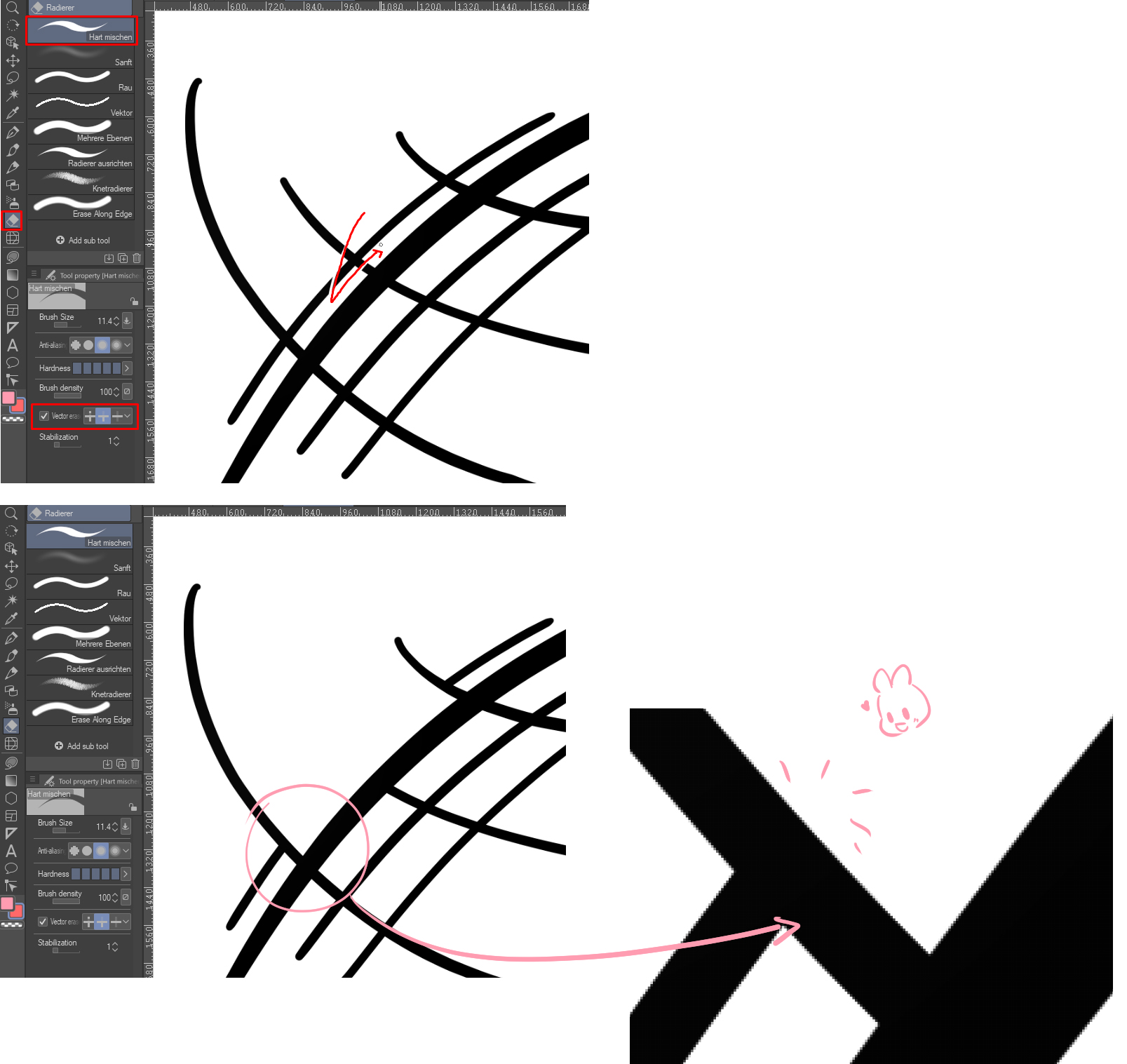 Erstens kannst du überflüssige Linien sehr einfach, schnell und präzise mit drei unterschiedlichen Modi löschen, wie man am, in die Luft gehaltenen, Ei sehen kann. So kannst du Linien mit Schwung zeichnen und überstehende Enden einfach wegradieren, ohne zu sehr auf deine gewollte Outline achten zu müssen.