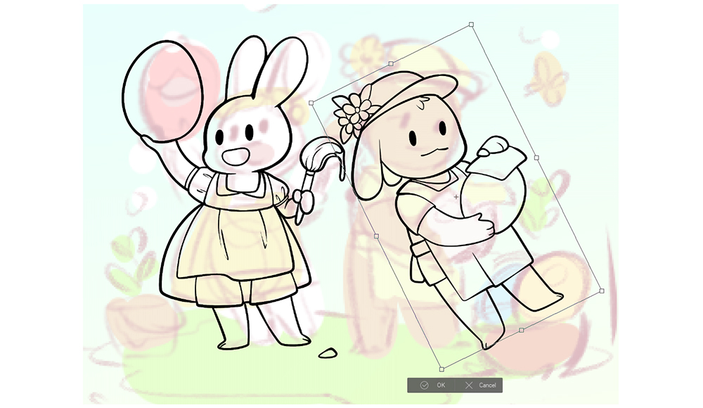 Die beiden Hasen sowie die Objekte wurden jeweils auf separate Ebenen (Lineart, Koloration, Licht und Schatten sowie Effekte) gezeichnet. So kann ich diese später verschieben, falls notwendig.