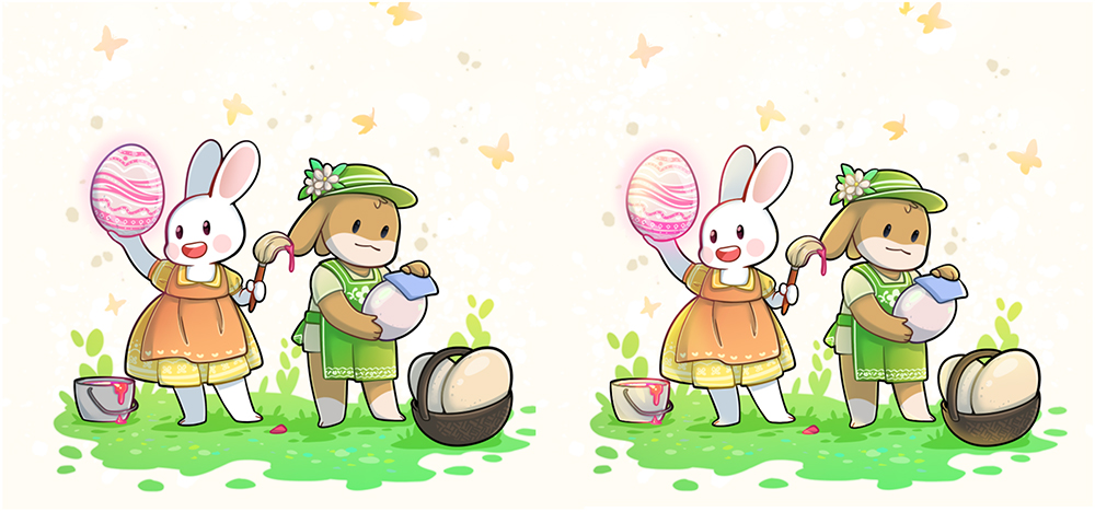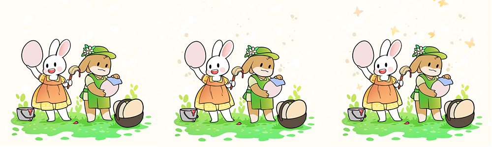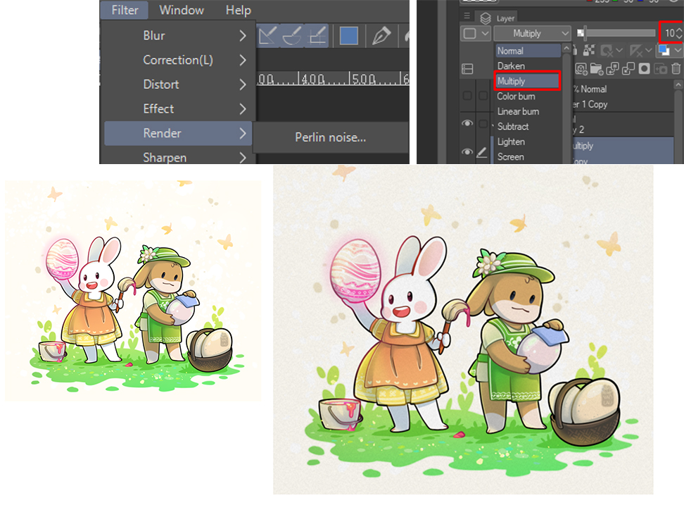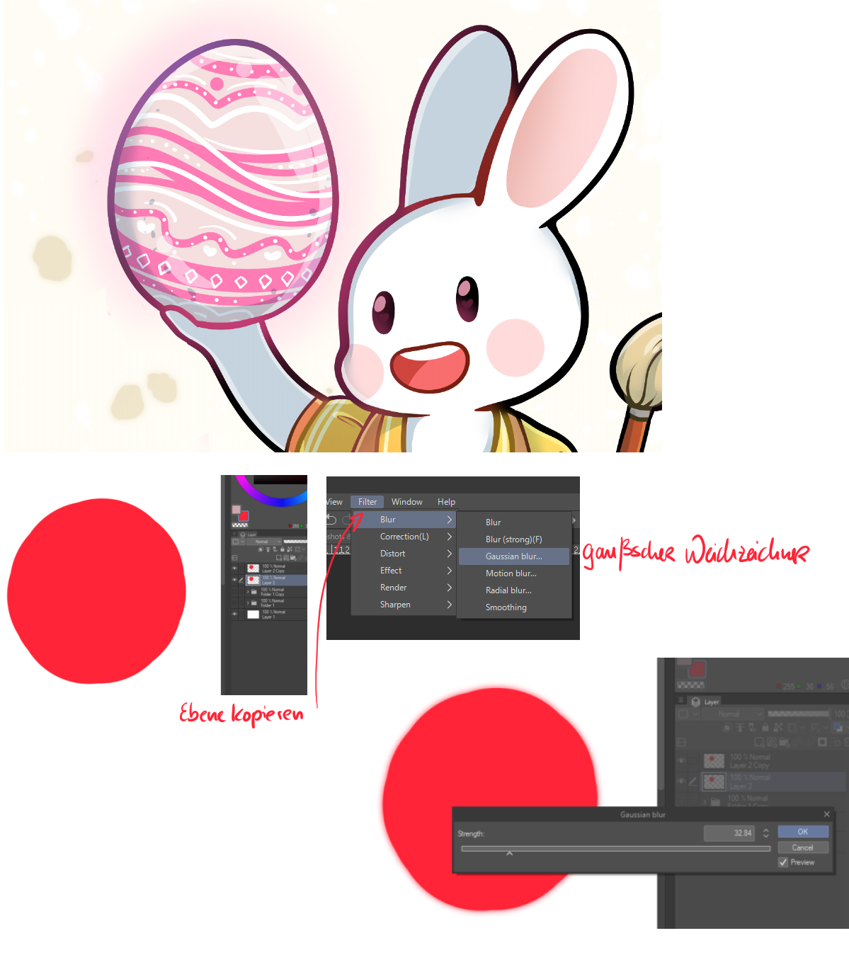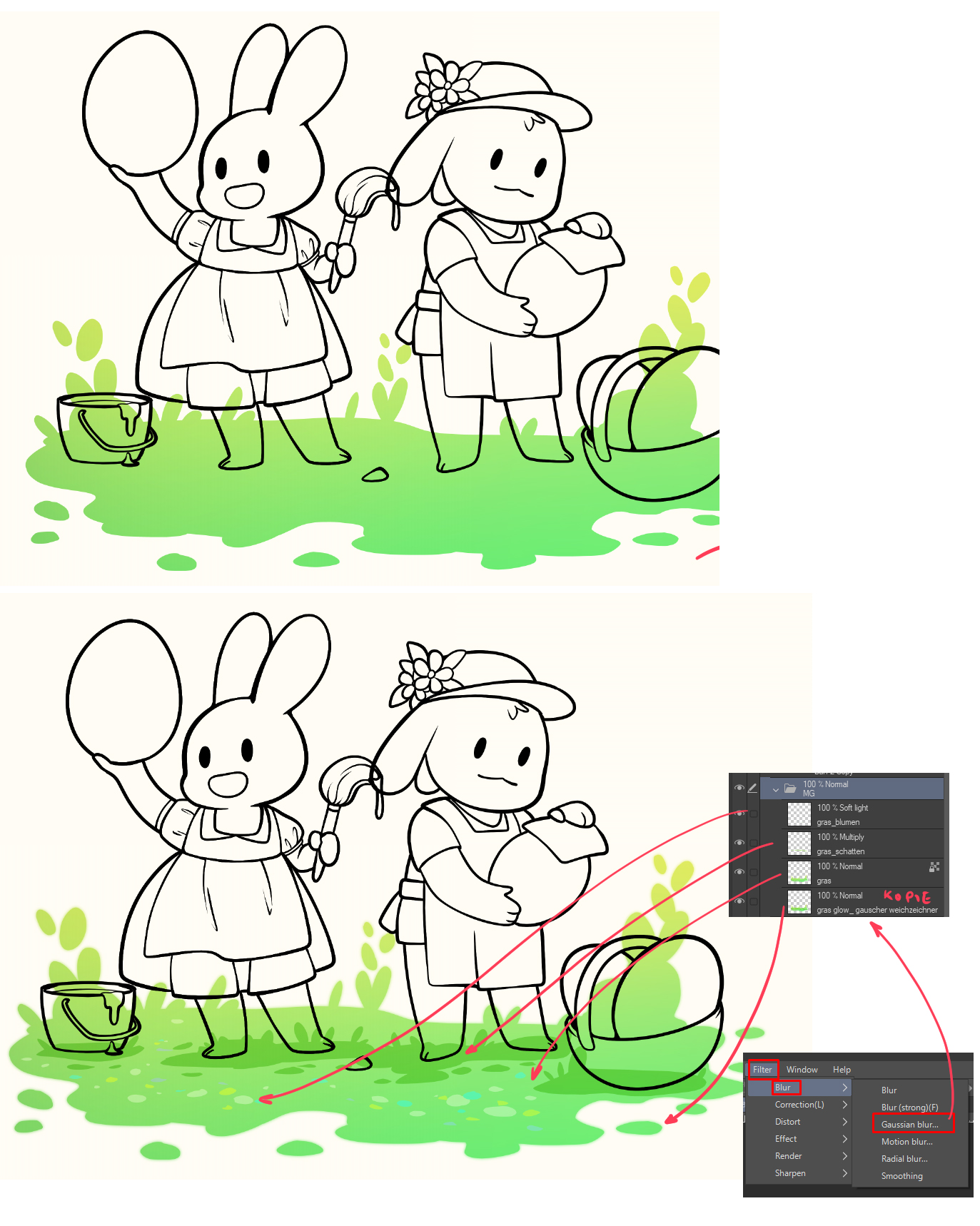 Nachdem die Lineart so weit fertig ist und ich damit zufrieden bin, wird eine Grund-Koloration angelegt. Ich fange mit dem Hintergrund an, bevor die Charaktere Farbe bekommen. Für das Ostermotiv möchte ich gern ein schönes, saftiges Grün haben. Hier entstehen Silhouetten von Gräsern und sobald die grobe Form fertig ist, werden Schatten, die die Charaktere werfen, und Details wie kleinen Blümchen hinzugefügt. Die Grasebene kopiere ich und wende den Effekt [Gaußscher Weichzeichner] an. Die Ebene wird unter alle anderen im Ebenenfenster platziert. Durch den Weichzeichner wirkt es ein bisschen, als würde das Gras etwas leuchten. Dies ist eine einfache Möglichkeit, um einen leichten Glow (Schein) zu erzeugen. Ich wende dies auch später noch bei ein paar Bereichen an (dem Ei und den Schmetterlingen).