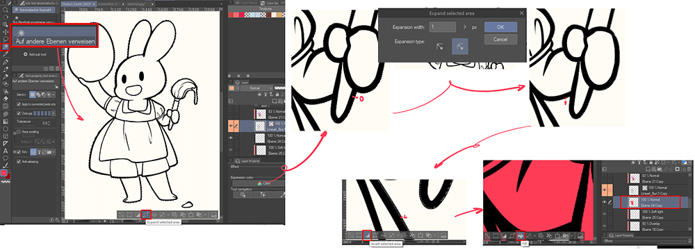 Diese nutze ich, um über die Charaktere nicht drüber zu zeichnen. Da ich eine saubere Strichzeichnung habe, kann ich mit dem [Lasso]-Tool den Bereich außerhalb des Objektes markieren.