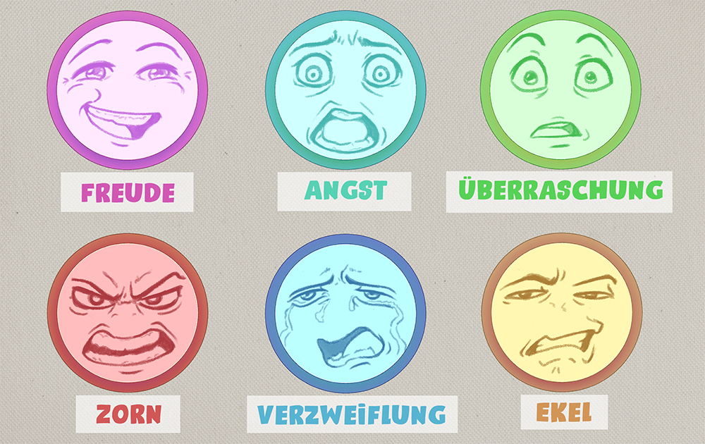 Freude, Angst, Überraschung, Zorn, Traurigkeit/Verzweiflung und Ekel/Abscheu