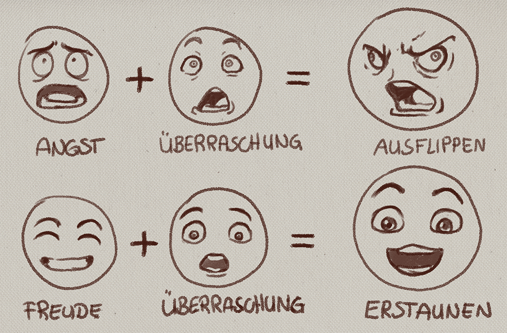 Bei der Unterteilung der vielen Arten von Emotionen hilft der Vergleich zum bekannten Farbkreis (nach Itten). Wie man hier aus den Primärfarben Blau, Gelb und Rot alle übrigen Farben und Farbtypen mischen, erweitern und kombinieren kann, so kann man das auch bei den Emotionen. Hierbei lässt sich die Mimik in sechs Grundausdrucksweisen unterteilen.