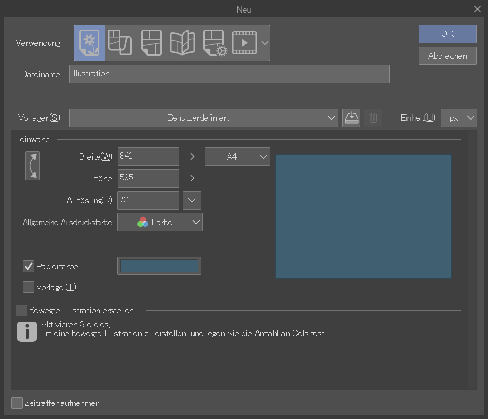 Bevor wir die Elemente zeichnen können, müssen wir ein neues CLIP STUDIO PAINT Dokument erstellen. Klicke dafür auf Datei > Neu, und dann wähle unter Verwendung > Illustration. Wähle A4 Format und stelle DPI auf 72 ein.