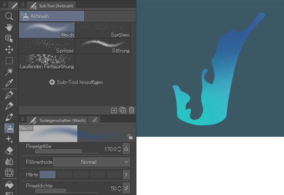 Wähle als Nächstes das Tool Soft Airbrush und male mit einer dunkelblaue Farbe die Oberseite, und mit einer grünlich-blauen Farbe die Unterseite an. Ich empfehle, die Pinselgröße ziemlich groß einzustellen und eine Dichte von 50 % für den Airbrush zu wählen.