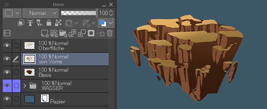 Erstelle eine neue Ebene mit dem Namen „Vorderseite” und male die vertikalen Ebenen der Felsen. Es ist wichtig, dass diese Ebene zwischen den ersten beiden liegt: