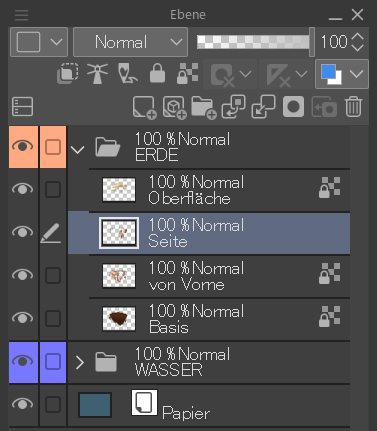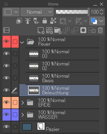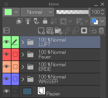 Um die Ebenen zu organisieren, erstelle einen Ordner und lege darin die 4 Ebenen ab, die wir für das Element Erde erstellt haben. Du kannst auch die Ebenenfarben in der oberen linken Ecke verwenden, um den Raum visuell zu organisieren. Ich benutze dafür Orange.