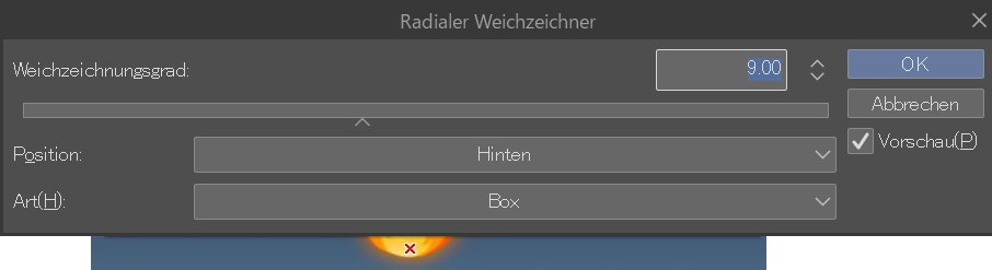Wenn du an den Einstellungen für diesen Weichzeichner arbeitest, wird ein rot-weißes Kreuz auf der Leinwand angezeigt. Es ist sehr wichtig, das Kreuz an der Basis des Feuers zu platzieren, damit die Richtung der Unschärfe von dort ausgeht.