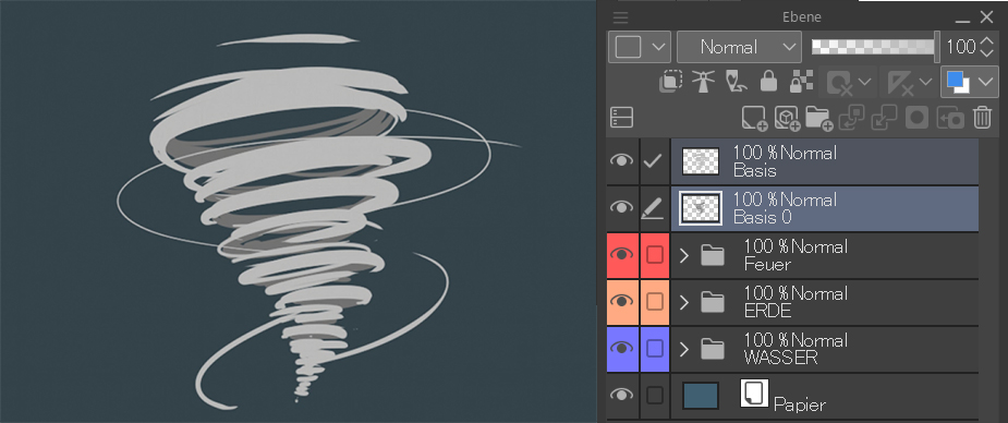 Wie bei den anderen drei Elementen erstelle zunächst eine neue Ebene mit dem Namen „Basis“. Zeichne einige geschwungene Linien mit dem G-pen in einer sehr hellgrauen Farbe. Beginne damit, oben einige dicke und große Linien zu malen, und verringere deren Größe und Dicke nach unten hin. Zeichne dann einige dünne, unordentliche Linien, um das Gefühl der Bewegung zu verstärken.